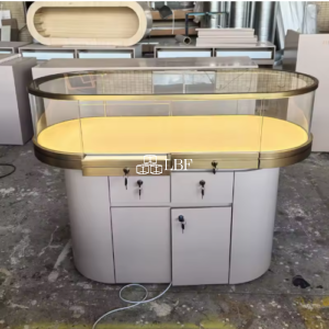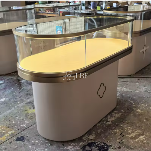 Arc-shaped luxury jewelry display cabinet, with metal edging and tempered glass, featuring soft light LED lighting inside. The elliptical design is elegant and suitable for jewelry stores or shopping malls. Customization is available.