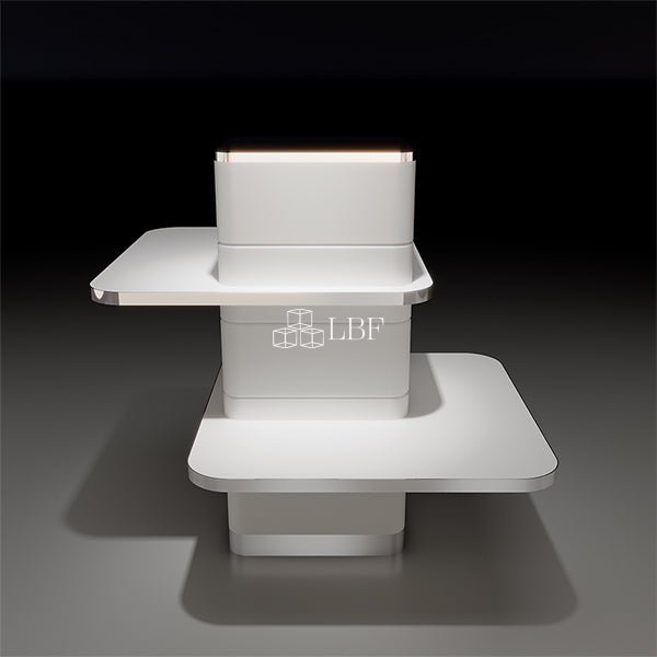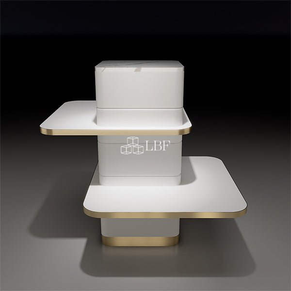 CR038 est un présentoir de haute qualité pour chaussures, sacs et accessoires. Il est composé d'un très beau MDF 30% à bord blanc brillant recouvert d'un métal brossé en finition électrolytique champagne. Le dessus de la table est en corian blanc. Le produit est disponible sur mesure.