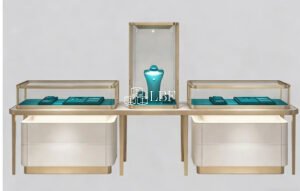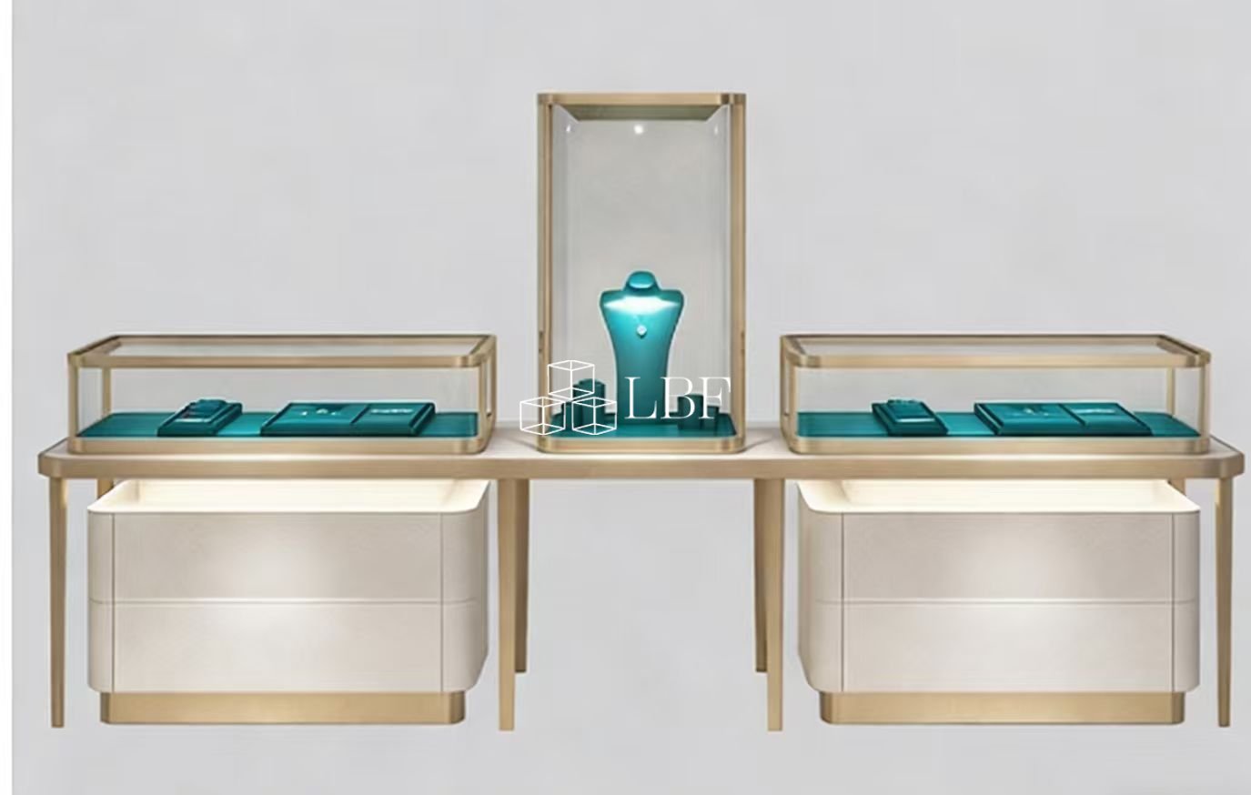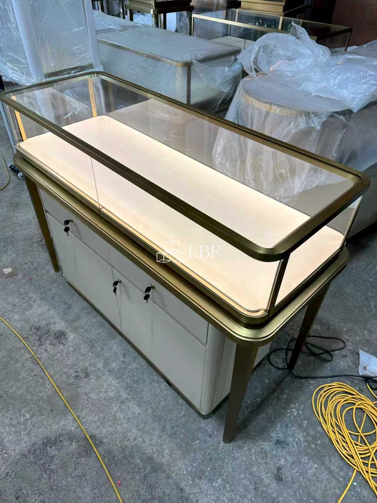 Vitrine pour bijoux de luxe et de semi-luxe, en métal doré et verre trempé, avec lumière douce LED, présentation à plusieurs niveaux, élégante et grandiose, adaptée aux bijouteries/centres commerciaux, personnalisable.