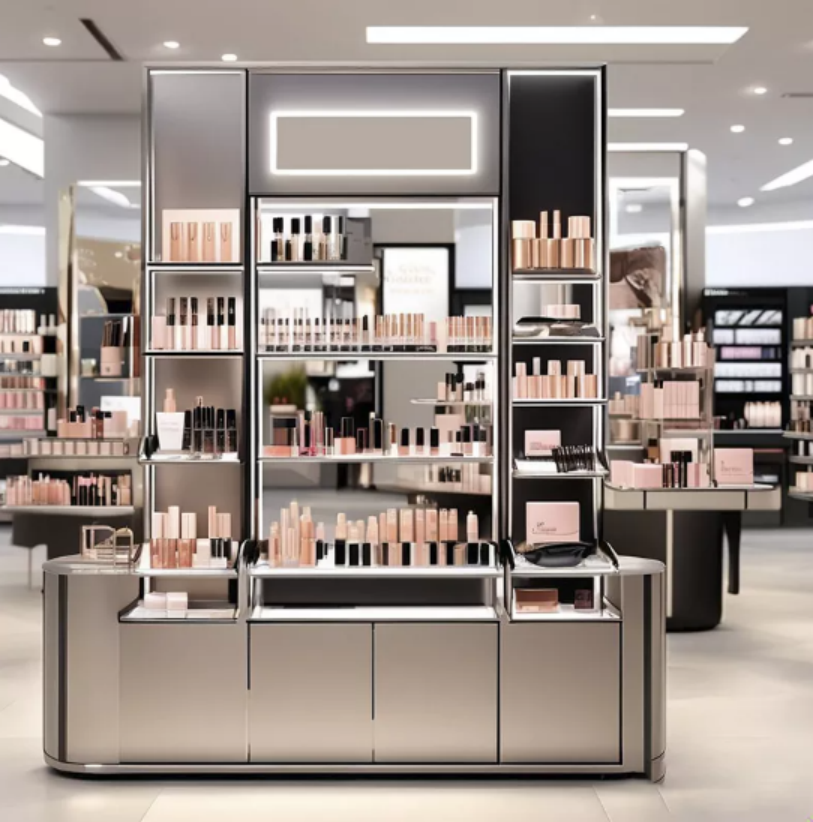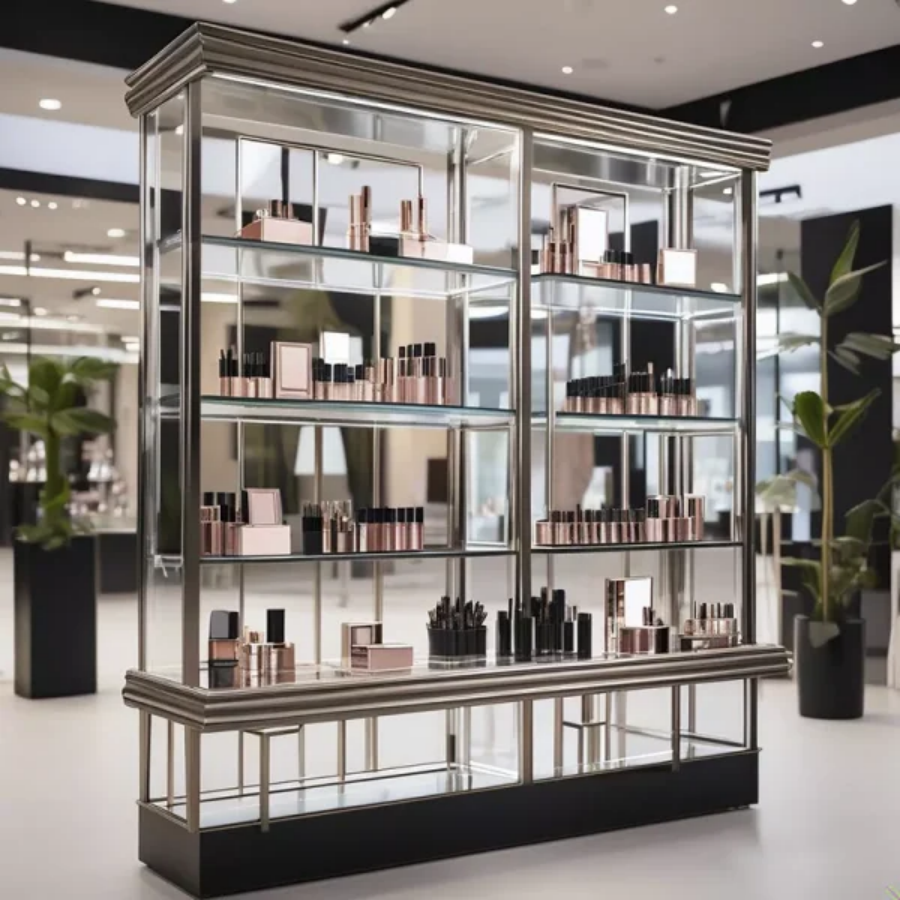 Example: Imagine you run a high-end cosmetics store specializing in luxury skincare products. You might opt for a sleek, high-gloss white lacquer finish to convey sophistication, with built-in LED lighting to highlight the products. Adjustable glass shelves and mirrored backdrops could be included to create a sense of depth and enhance product visibility.
