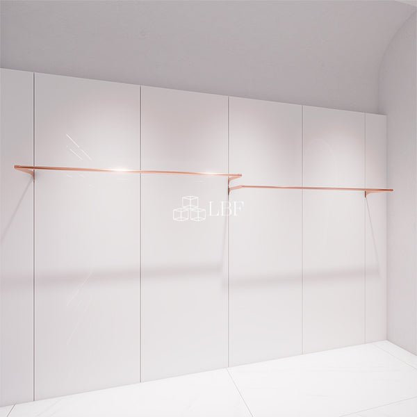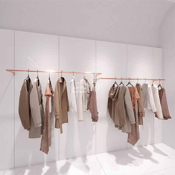 CR010 è un appendiabiti da parete per esporre gli abiti. È realizzato in metallo molto bello con placcatura in oro rosa. Il binario è regolabile a qualsiasi altezza secondo le vostre richieste. Il prodotto è disponibile su misura.
