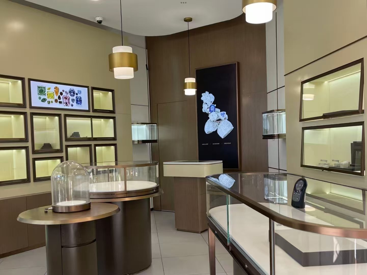 Questo espositore per gioielli presenta una struttura in metallo bianco e bronzo, un coperchio in vetro trasparente con illuminazione soffusa incorporata e cassetti laterali ben organizzati per riporre i gioielli. Il mobile presenta una struttura leggera e lussuosa, non solo per esporre i gioielli in modo sicuro, ma anche per esaltare lo stile di alta gamma del negozio.