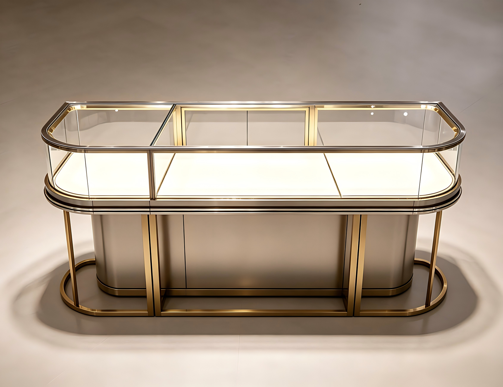 LBF è specializzata in vetrine su misura per gioiellerie di lusso, creando un'estetica espositiva esclusiva per negozi di alta gamma. Questa vetrina rettangolare ha una base in vernice beige soft-matte, abbinata a vetro temperato ad alta trasparenza, che presenta la texture leggera e trasparente che sarà popolare nel 2026.