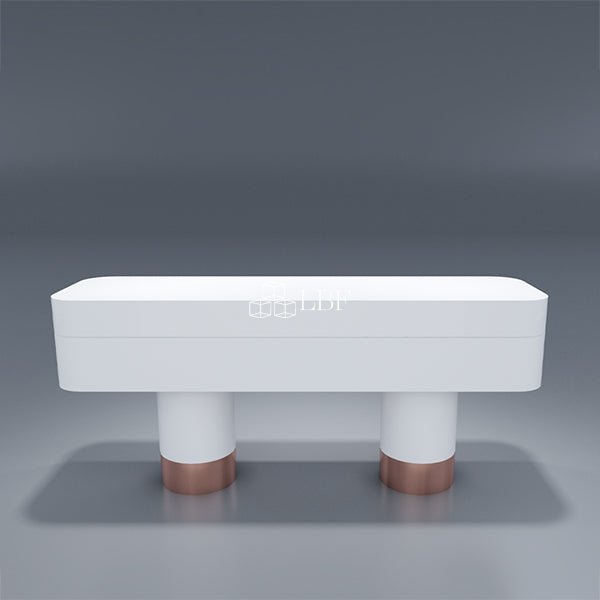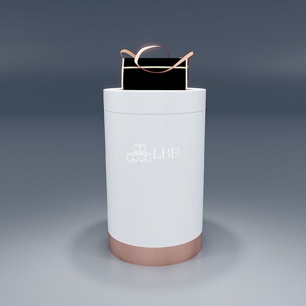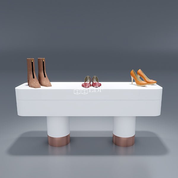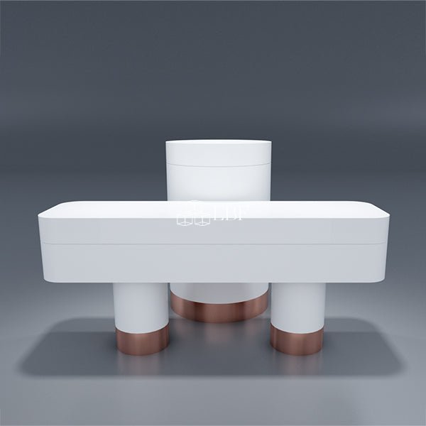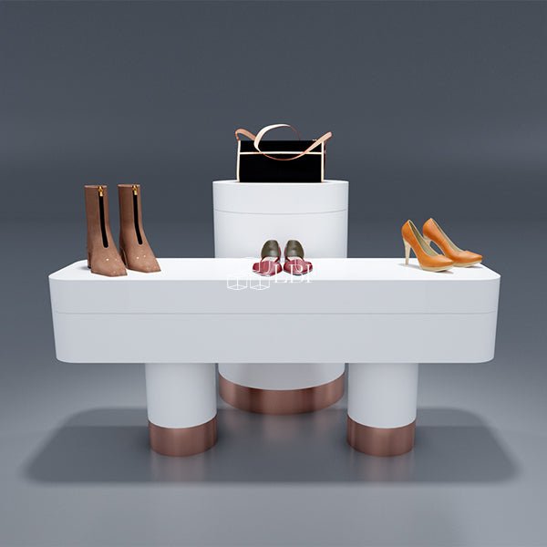 CR005 is a set of clothes display stand including 2 itemS of table presentation. It is made of very nice wood in matt white and stainless electroplating rose gold. The bottom skirt is stainless steel 100mm Height. The product is available for custom made.
