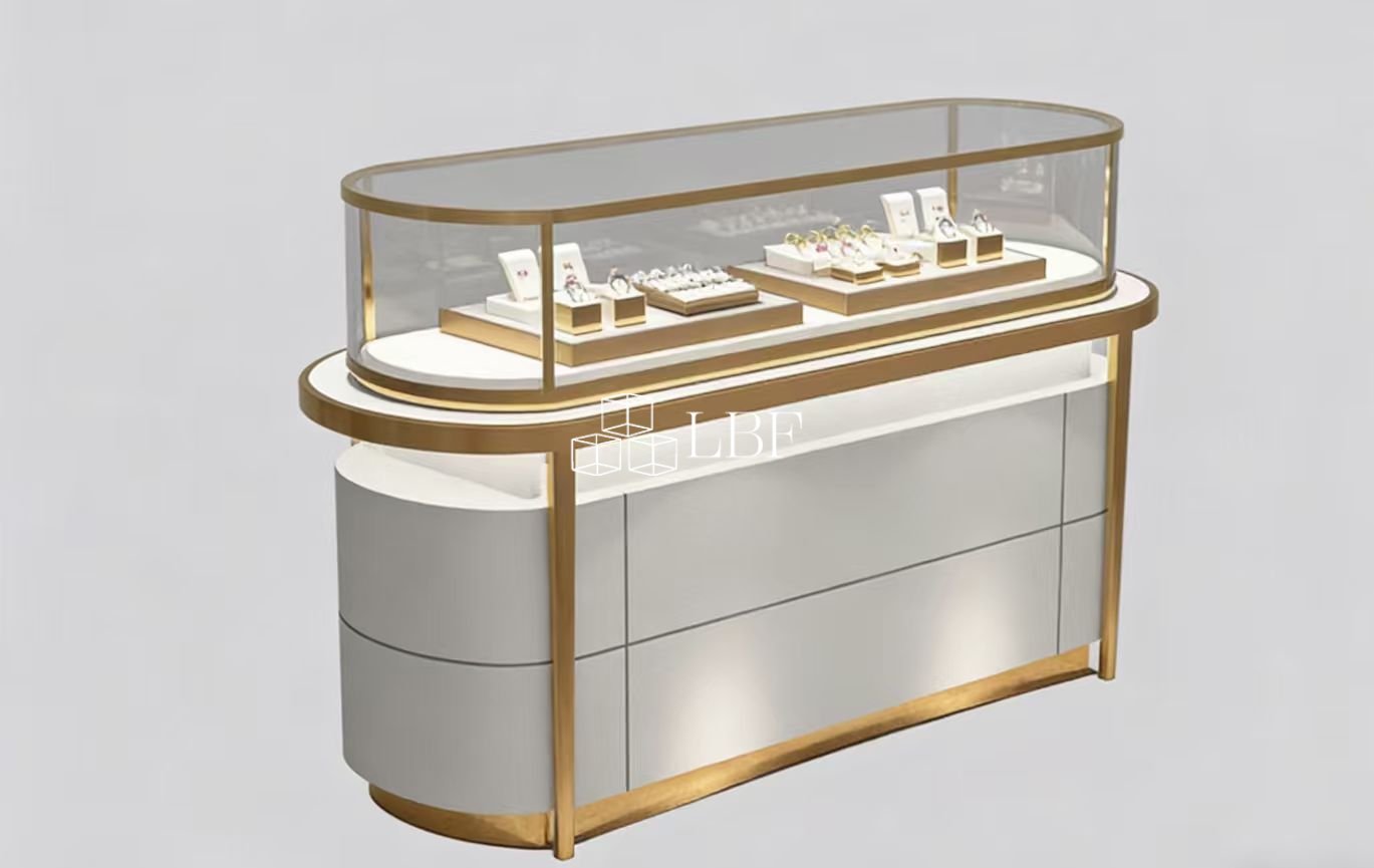 Arc-shaped luxury jewelry display cabinet, with gold metal edging and tempered glass, LED soft light, elliptical streamlined design, elegant and grand, suitable for jewelry stores/malls, customizable.